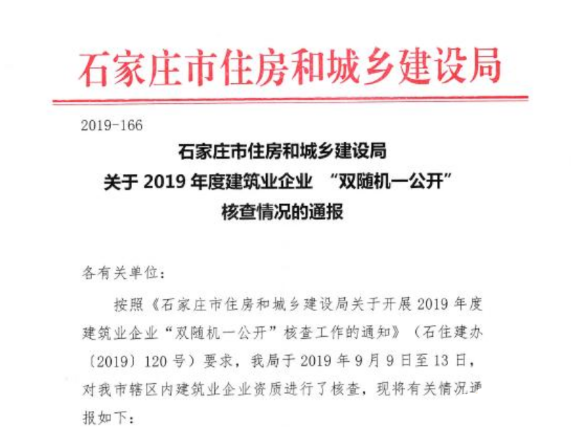 月26日石家莊住房和城鄉(xiāng)建設(shè)局發(fā)布《關(guān)于2019年度建筑業(yè)企業(yè) “雙隨機(jī)一公開” 核查情況的通報(bào)》,2019年9月9日至13日石家莊住房和城鄉(xiāng)建設(shè)局對(duì)轄區(qū)內(nèi)建筑業(yè)企業(yè)資質(zhì)進(jìn)行了核查,本次共核查238家建筑業(yè)企業(yè),其中僅41家達(dá)到資質(zhì)標(biāo)準(zhǔn)要求,共有135家企業(yè)不合格。